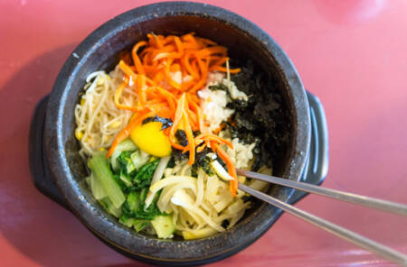 Se encante com o arranjo astuto de carnes e legumes em cima de uma tigela de arroz branco morno, em seguida, ajuste o tempero com vários molhos e pastas de pimentão, misture tudo e saboreie um novo sabor a cada mordida. Para emoção adicional, experimente a versão servida em uma panela de pedra quente, que transforma qualquer arroz tocando seus lados crocante e dourada.