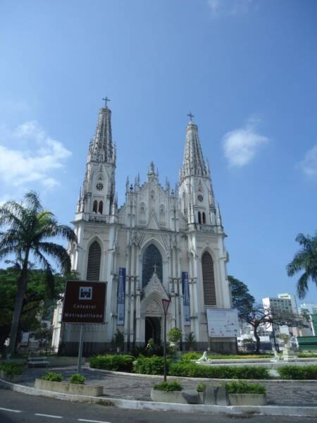 Em estilo neogótico, a catedral foi construída no mesmo lugar onde, até 1918, ficava a igreja de Nossa Senhora da Vitória, que começou a ser edificada em 1551, quando a cidade ainda se chamava Vila Nova.