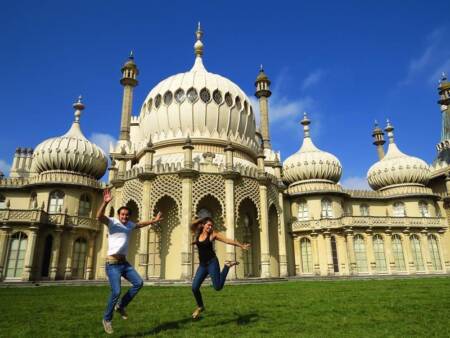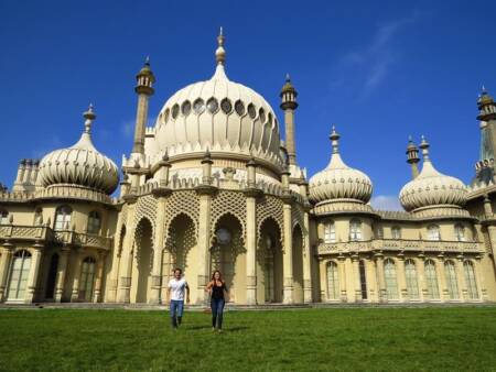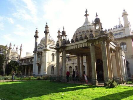 Em Brighton fomos meio que sem roteiro, a única coisa que eu sabia é que tínhamos que conhecer o Royal Pavilion –o palácio mais diferentão da Inglaterra. Ele pertenceu ao Rei George 4º, um dos membros da realeza mas figura que se tem notícias….o cara gastou os tubos num palácio no estilo oriental – no exterior cheio de minaretes e a decoração interna com muita influência chinesa e indiana. O palácio é lindo e vale muito a pena pagar para conhecer o seu interior, que mantêm muito da decoração original –é de ficar chocada (infelizmente, nada de fotos ).