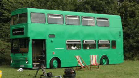 O Big Green Bus fica estacionado em um acampamento na região de Sussex.