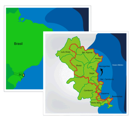 A região Costa Verde e Mar é formada por 11 municípios, sendo oito no litoral: Balneário Camboriú, Balneário Piçarras, Bombinhas, Itajaí, Itapema, Navegantes, Penha e Porto Belo e três no interior, Ilhota, Camboriú e Luis Alves.