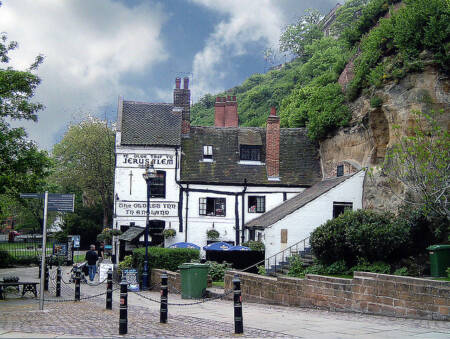 Parada favorita dos cavaleiros das cruzadas a caminho da Terra Santa, o Olde Trip to Jerusalem tem estado sob o Castelo de Nottingham desde 1189. O local está ligado às grutas na base do castelo e ainda possui o clima envolvente de uma caverna. Nas adegas do pub ficavam o cárcere do castelo e um antigo local para rinha de galo.