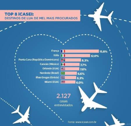 Conhecer as belezas do próprio país é o objetivo de 6,6% dos apaixonados, que têm como preferência o nordeste brasileiro. Na sexta posição do ranking está a Grécia, com seus passeios históricos e praias mediterrâneas, correspondendo a 6,3% das escolhas. Para fechar o Top 8 do iCasei está Miami, nos Estados Unidos, destino de 6,0% dos casais pesquisados.