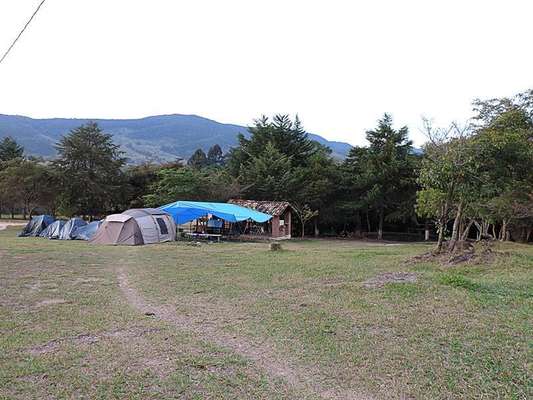A área de camping é toda gramada e tem alguns quiosques que servem como base de apoio para grandes barracas ou área coberta para montar barracas menores.