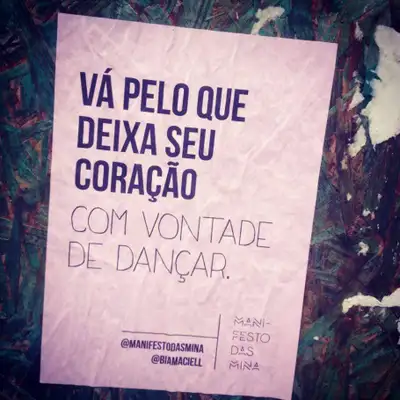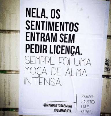 Qual é a voz que “fala” dentro de você? Para refletir sobre esta pergunta, a designer paulistana Bianca Maciel, de 21 anos, criou o projeto “Manifesto das Mina“, que espalha lambe-lambes com frases sobre assuntos diversos pelos bairros da cidade de São Paulo. O objetivo da campanha é, entre outros aspectos, dar voz às mulheres.