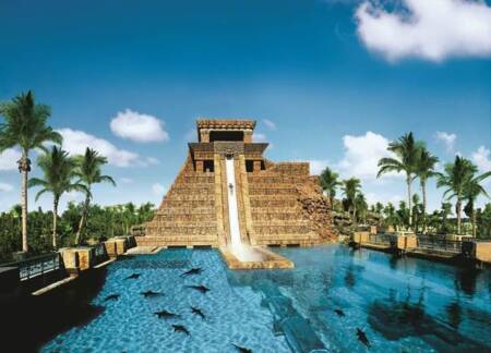 O parque aquático Aquaventure impressiona não só pelas 11 piscinas, mas também pelo toboágua Mayan Temple (Templo Maia), onde os hóspedes podem competir uns com os outros para ver quem é o mais rápido na descida.