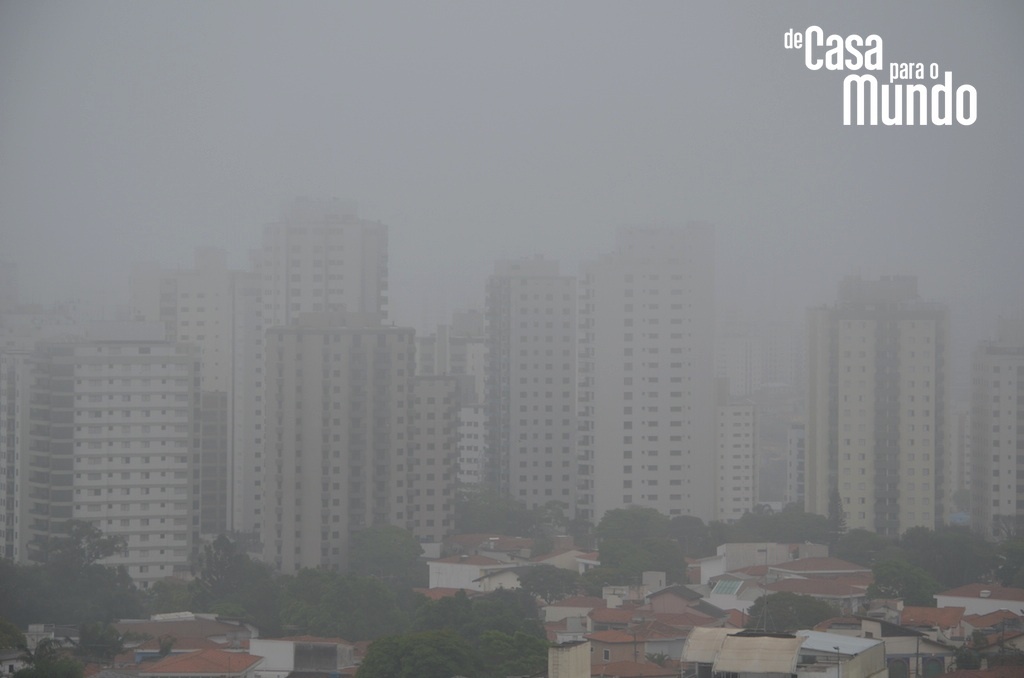 Nós estivemos lá e comprovamos tudo isso na prática. A fumaça do carvão somada a fumaça dos automóveis resulta em um ar difícil de respirar. O ar de todo o país, mas especialmente de Pequim é pesado, denso e o seu organismo não poderia responder de outra maneira: nariz entupido, olhos lacrimejantes e garganta irritada. Ficamos tão estressados com todo esse incômodo que nos esquecemos de fotografar a fumaça branca que abraçou Pequim todos os dias que estivemos na cidade. Mas só para ilustrar, dá uma olhada na foto abaixo. Feita em São Paulo, da sacada do nosso apartamento. Faz frio e uma névoa densa e baixa cobriu a cidade no meio da tarde. A qualidade do ar de São Paulo definitivamente não é exemplo de nada, mas nós somos capazes de distinguir poluição de neblina, certo? Em Pequim eles não têm dúvidas: a névoa densa e baixa que envolve a cidade é mesmo poluição…