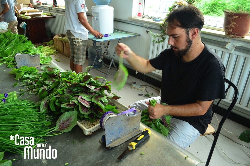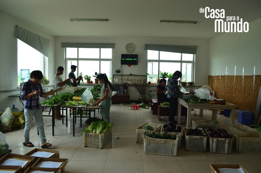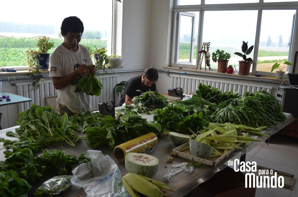 Chegamos meio cabreiros, desconfiados. Ficamos seis dias perambulando em Pequim antes de partirmos para fazenda num domingo de muito calor. Domingo normalmente é dia de folga de quem trabalha e nós achávamos que não encontraríamos nenhum dos funcionários por lá. Ledo engano. Apesar de não trabalharem nesse dia, são poucos os que voltam para suas casas aos domingos. A família da maioria deles mora longe dali e acaba sendo mais fácil para eles ficarem assistindo TV, lendo, conversando ou ainda dando risada dos gringos que se aventuram longe da cidade grande do que ir para casa. Sim, porque para eles é quase inexplicável que pessoas que teoricamente poderiam estar em qualquer outro lugar do mundo escolhessem estar lá. Separando quiabos, lavando cenouras, pesando caixas, carregando o caminhão, fazendo entregas…