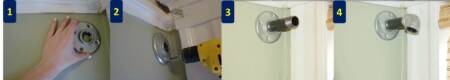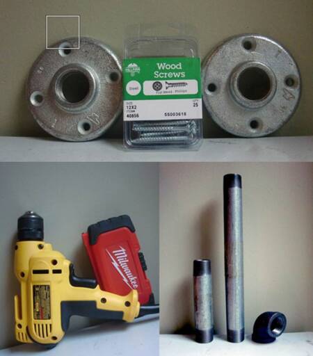 7) A segunda flange deve ser rosqueada no tubo menor e afixada na parede. Antes é importante marcar na parede onde serão feitos os furos. Usar a broca que é menor que os parafusos para furar a parede. Depois basta segurar a flange na parede e apertá-la com a broca de mão.