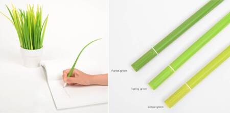 Criada pelo estúdio de design coreano Zeup, cada caneta-folha custa 5 dólares* (sem o frete) e pode ser comprada online através da Connect Design que entrega no Brasil. As canetas com design criativo e original são uma boa opção para decorar a casa ou a mesa do escritório com um ar natural, com este vaso de plantas que não requer maiores cuidados e ainda é funcional. Para montar um vaso como o da imagem são necessárias cerca de 35 canetas das três cores.