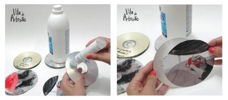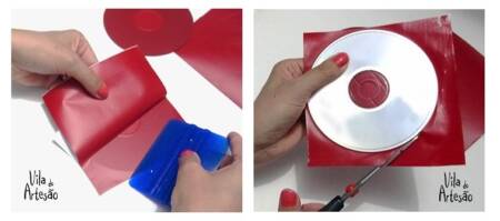 Em outro CD cole com cuidado o adesivo de vinil da cor que escolher, use uma espátula para alisar o adesivo e recorte o excesso.