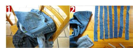 1) Separe de 2 a 3 calças jeans velhas e utilize uma régua para a partir da costura, medir tiras de 5cm de largura.