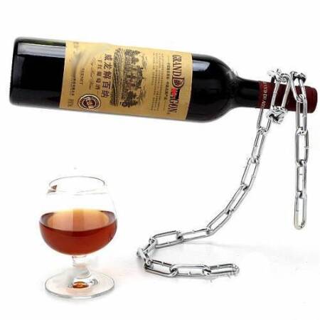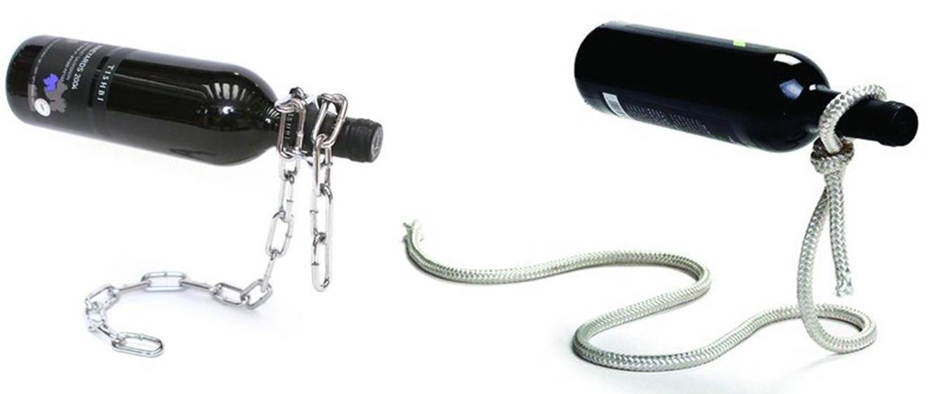 O suporte de mesa em formato de corrente ou corda dá a impressão da garrafa estar magicamente flutuando.