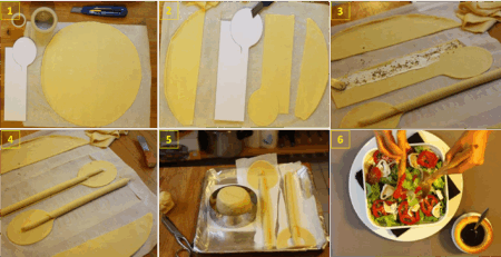 Pode ser utilizada uma massa preparada em casa, como a de pizza ou lasanha, por exemplo ou ainda comprar uma massa pronta. Cortar no formato dos talheres e colocar para assar. As lascas que restarem, podem ser moldadas transformando-se em uma molheira ou até mesmo no recipiente para salada.