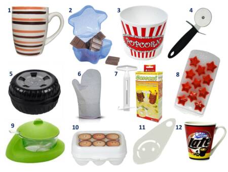 1)Caneca Ceramica Dj Farm Or R$ 3,99; 2)Porta Mix Estrela Surpresa Plasútil R$ 2,49; 3)Balde para pipoca R$ 2,99; 4)Cortador de Pizza Aço Inox Yangzi R$ 4,90; 5)Porta Metade Roda de Carro Plasútil R$ 2,79; 6)Luva Térmica Cano Curto – Qualytermic R$ 4,94; 7)Descascador de Abacaxi Cascaxi – Keita R$ 4,90; 8)Forma de gelo com desenhos sortidos R$ 3,15; 9)Molheira Invicta R$ 3,90; 10)Porta Ovos Decora Plasútil R$ 2,79; 11)Separador de Gemas Plasútil R$ 1,20; 12) Caneca Late 230ml em porcelana R$ 3,99.*