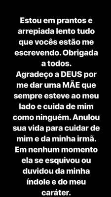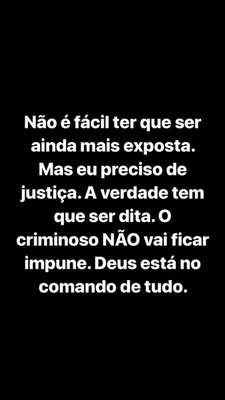“Poderia ficar horas falando de tudo de errado que está acontecendo com as investigações. Mas Deus é tão incrível, tenho todas as provas para elucidar o crime. Sempre tive boa índole e postura e isso ninguém muda, e ninguém tira de mim. A verdade é única”, finalizou.
