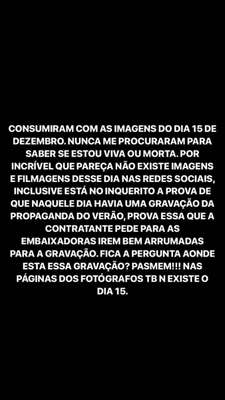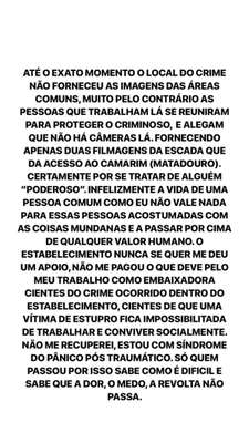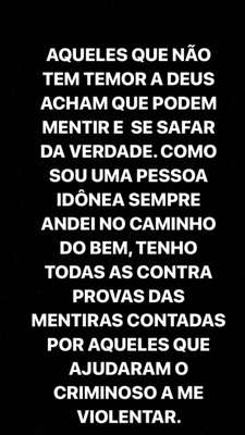 “O agressor não se aproximou de mim quando eu estava lúcida. Eu não tenho lembranças dele. Fui levada para um lugar desconhecido por mim e acredito que também seja para a maioria das pessoas que lá frequentam. Nenhuma das pessoas que me acompanhavam no dia me socorreu, pelo contrário, me abandonaram, negaram meus pedidos de socorro, e todas as provas levam a crer que compactuaram para que o estuprador pudesse agir”, continuou.