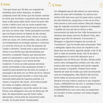 “Nunca imaginei que passaria por isso na minha vida. Tenho pesadelos horríveis que me fazem dormir só depois do dia clarear, sentia dores fortes pra urinar, dores no corpo, entre as coxas. Em contrapartida, vejo a polícia civil empenhada em proteger apenas o criminoso e o local do crime por se tratar de pessoas de ‘poder e dinheiro’. Aonde está o apoio devido à vítima e sua família, que são devastadas por tamanha crueldade?”, questionou.