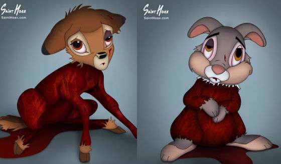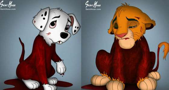 Para chamar a atenção ao uso da pele de animais pela indústria da moda, o artista Saint Hoax usou imagens de personagens da Disney como se estivessem tido seus couros arrancados.