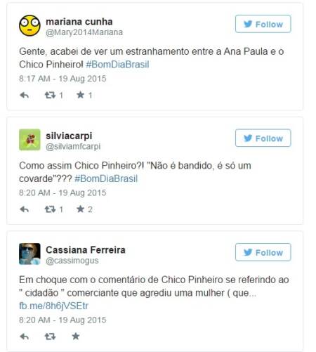 Ao opinar sobre o crime, o jornalista alegou que o agressor não é bandido. “É covarde”, comentário que gerou discordância entre os âncoras, ao que Ana Paula despondeu: “Bandido e covarde”. Nas redes sociais, o incidente rendeu o debate sobre a opinião do jornalista, que lhe rendeu uma série de acusações: