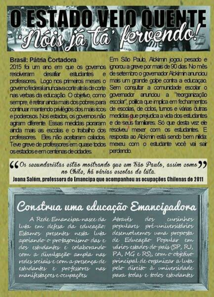 Com essa “reorganização escolar”, foi determinado que mais de 300 mil alunos seriam transferidos e 94 escolas fechadas. Para mostrar que são contra essa medida, alunos resolveram se mexer e, em busca de diálogo, começaram a ocupar suas escolas.