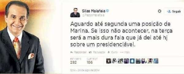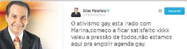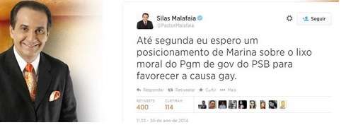 Recentemente, Malafaia manifestou sua opinião contrária a questões ligadas aos direitos da comunidade homossexual. Na ocasião, por meio da sua conta no twitter, o pastor questionou o programa político da candidata à presidência Marina Sliva , em relação a propostas de apoio ao casamento gay e à criminalização da homofobia.