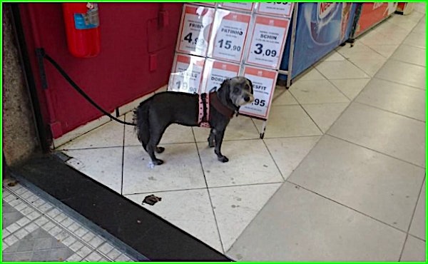 Já em outro mercado esta cadelinha aguardava pelo dono(a) com um olhar de leve tristeza. Só nunca saberemos se era por saudade do amigo ou por ver os preços cada dia mais abusivos dos mercados.