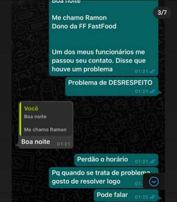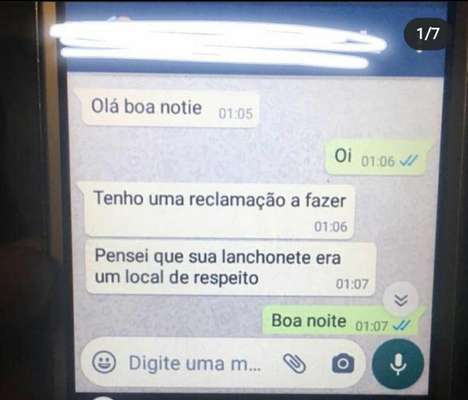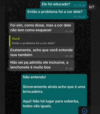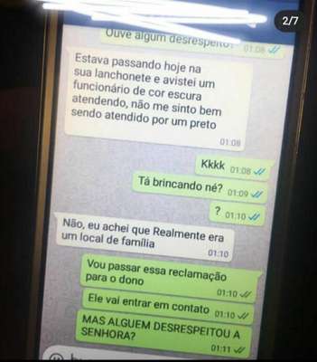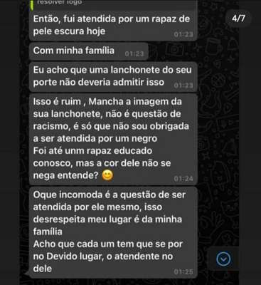 “Então, fui atendida por um rapaz de pele escura hoje, com minha família. Eu acho que uma lanchonete do seu porte não deveria admitir isso. Isso é ruim, mancha a imagem da sua lanchonete. Não é questão de racismo, é só que não sou obrigada a ser atendida por um negro. Foi até um rapaz educado conosco, mas a cor dele não se nega, entende? O que incomoda é a questão de ser atendida por ele mesmo, isso desrespeita meu lugar e da minha família. Acho que cada um tem que se por no devido lugar, o atendente no dele”, escreveu a suposta cliente.