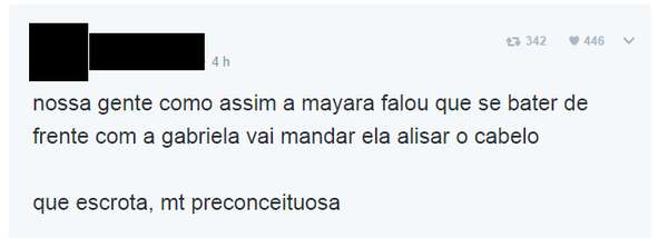 Mayara contou que pretende indicar Gabriela para o paredão. Ela declarou: “vou votar nela, e se ela falar alguma coisa pra mim, vai ouvir que precisa alisar o cabelo crespo”.