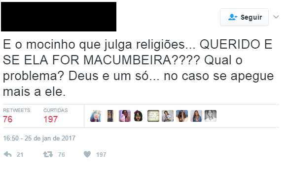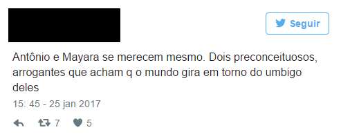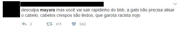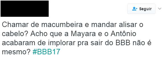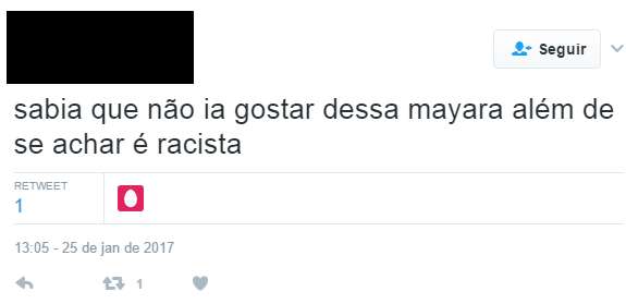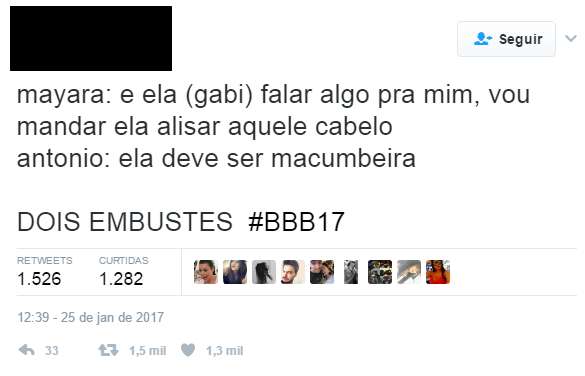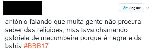 Além disso, muitos internautas também vêm criticando Antônio, participante do reality show que já parece estar envolvido com Mayara. Isso porque ao descobrir que Gabriela é da Bahia, disse que ela deveria “ser macumbeira”.