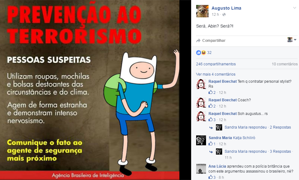 “ABIN, fiquei sabendo que os terroristas leram esse post e já mandaram comprar um lote de camisas polo numa loja da Lacoste.” – Pedro Munhoz