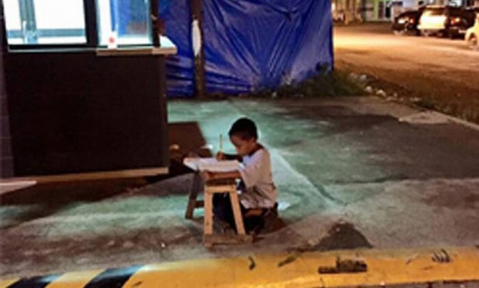 Depois de ser fotografado fazendo a lição escolar sob a luz de uma lanchonete nas Filipinas, o garoto sem teto Daniel Cabrera ganhou uma bolsa de estudos.