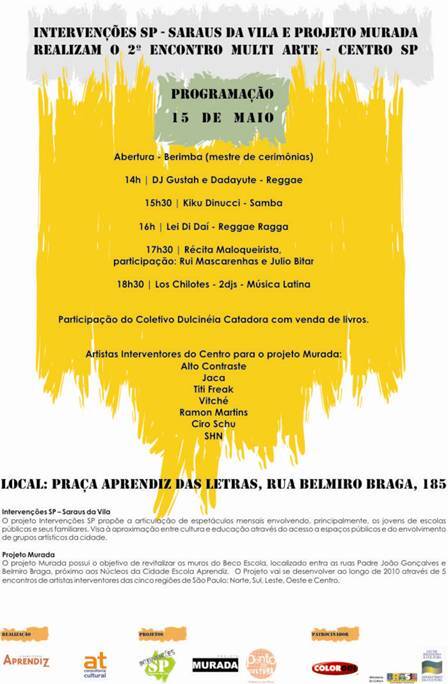 No dia 15 de maio acontece a II Edição conjunta dos projetos Intervenções SP, Saraus da Vila e Murada, com a participação de artistas convidados do Centro da cidade de São Paulo. O evento é Catraca Livre.