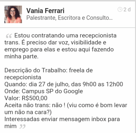Decidindo expor uma ferida ainda dolorosa da sociedade brasileira, a palestrante escritora e consultora, Vania Ferrari resolveu fazer uma inversão papéis no mercado de trabalho e publicou uma vaga exclusivamente para transexual. “Na verdade, eu precisava de uma recepcionista para meu stand-up desta quarta feira (27) no Google e comecei a descrever o perfil. Então, pensei em dar voz para as trans que são sempre discriminadas”, explica a autora do livro Crônicas do Bizarro Mundinho Corporativo.