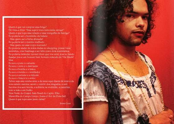 Acho que a vida de uma pessoa LGBTT na quebrada é ser subversiva. É não ser a cara do próprio movimento LGBTT. Acho que não posso dizer com toda a propriedade pois eu não me enquadro (hoje) em nenhuma das siglas, mas eu acompanho o movimento dentro da periferia, sempre presente em rodas que discutam as condições da gay periférica.
