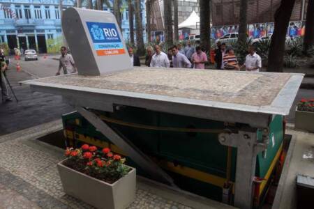 Está em teste, na Lapa, uma lixeira inteligente. Subterrânea, o que evita que o lixo se espalhe e é capaz de armazenar cinco vezes mais lixo que uma caçamba normal, já que também é capaz de compactá-lo.