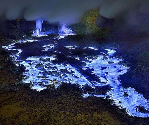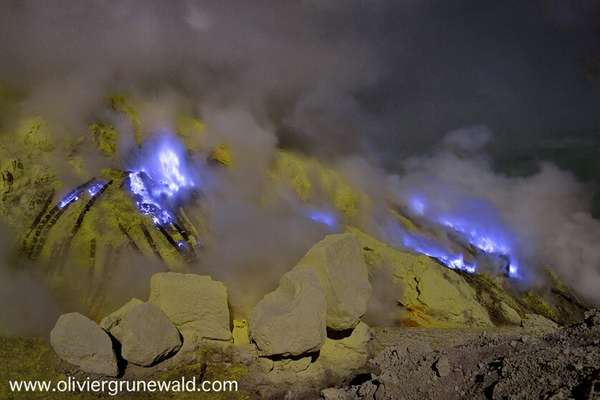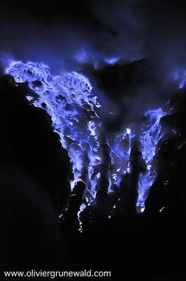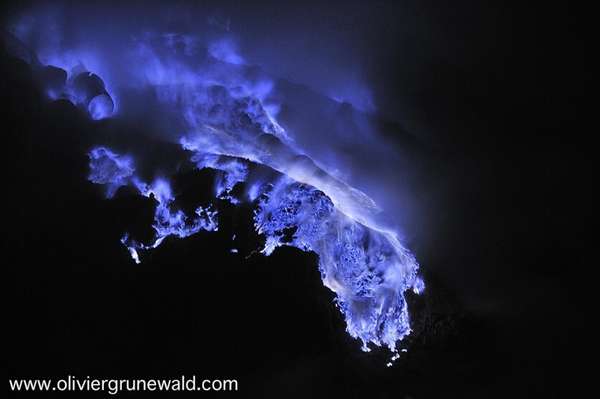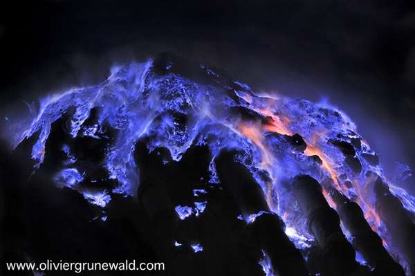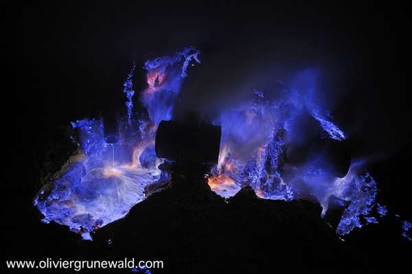 Clicadas pelo fotógrafo Olivier Grunewald e seu amigo Régis Etienne, a dupla visitou a região algumas vezes para registrar o fenômeno protagonizado pela lava azul brilhante. A montanha, que durante o dia funciona como uma mina para os trabalhadores da região, à noite testemunha este incrível evento digno de uma obra surrealista.