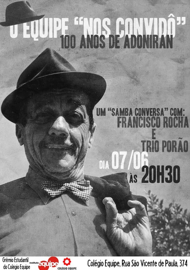 O Instituto Equipe Cultura e Cidadania e o Grêmio dos alunos do Colégio Equipe preparam para esta segunda-feira, 7, às 20h, um encontro para centenário do Adoniran Barbosa. O evento “O Equipe nos convidô: 100 anos de Adoniran” contará com a participação do professor Francisco Rocha, autor do livro “Adoniran, poeta da cidade”.