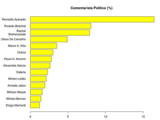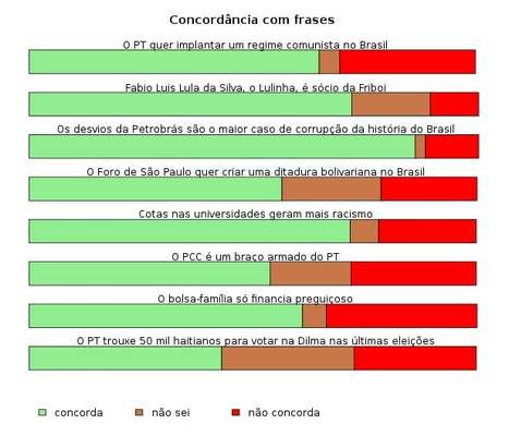 A apuração, que aconteceu entre 13h30 e 17h30, contou com a participação de 571 pessoas. Entre alguns resultados da pesquisa, 73% não confiam nos partidos, 70% não confiam nos políticos, 64% acreditam que o PT quer implantar um regime comunista, 71% que Lulinha, o filho do ex-presidente, é sócio da Friboi e 53% que o PCC é um braço armado do PT.