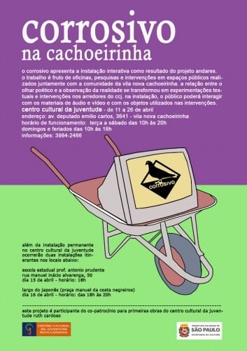 Organizada pelo Coletivo Corrosivo, a instalação é resultado de oficinas, pesquisas e intervenções realizadas pelo Projeto Andares em espaços públicos no bairro da Vila Nova Cachoeirinha. Na instalação, o público poderá interagir com registros audiovisuais e objetos utilizados nas intervenções. Além da instalação permanente no CCJ, ocorrerão três instalações itinerantes em ruas do bairro.