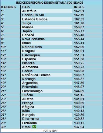 O Índice de Retorno de Bem Estar à Sociedade, IRBES, avalia 30 países com as maiores cargas de tributos do planeta e leva em consideração o montante da carga tributária das três esferas de governo federal, estadual e municipal, em relação ao PIB e ao Índice de Desenvolvimento Humano, IDH, que mede a qualidade de vida oferecida à população.