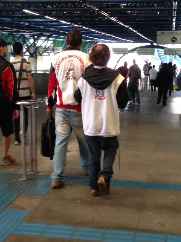 Enquanto o mundo ainda está tomado por intolerância e falta de empatia, eis um foto que vai resgatar a sua fé na humanidade: um torcedor são-paulino guiando com o braço um corinthiano com deficiência visual no metrô de São Paulo, na Barra Funda.