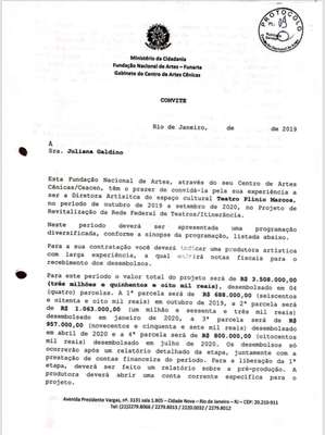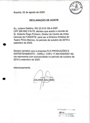 No documento, Juliana Galdino assina uma declaração em que diz que aceita o cargo de diretora artística do Teatro Plínio Marcos, em Brasília, no período entre outubro de 2019 a setembro de 2020.