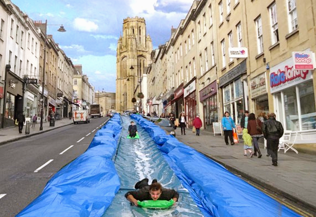 Na verdade, o objetivo da intervenção é mudar a cara da rua, fechando a via para a circulação de carros e transformando o espaço em área de convivência, passeio e diversão. A iniciativa tem o apoio da câmara Municipal de Bristol e o tobogã já foi até testado. O verão promete.