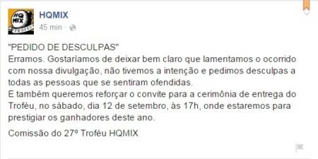 E seguiram “Mesmo assim, estamos sendo bombardeados como se não houvesse um passado. (…) Alguém que ao menos tivesse o bom senso de lembrar que a gente não tem essa característica machista e que pode ter sido um engano. Sempre estimulamos em nossas exposições e eventos a mulher”. Veja o post completo aqui.