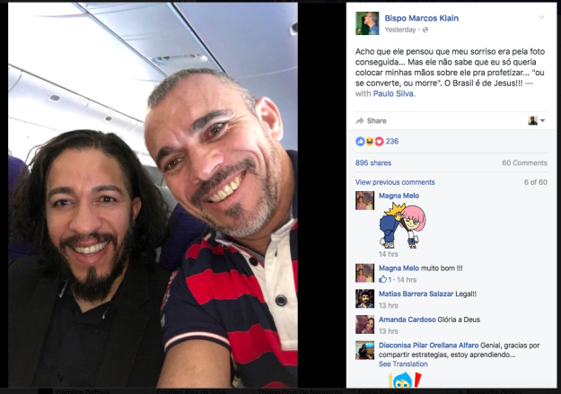 1 – O Bispo Marcos Klain postou nesta terça-feira (19) uma foto com o Deputado Jean Wyllys (PSOL) e colocou como legenda “ou se converte, ou morre”. Klain afirmou que fingiu ser um fã para tirar uma foto com Wyllys. O episódio aconteceu dentro de um avião que partia do Rio com destino para Londres. O post foi apagado hoje na manhã desta quarta-feira (20) e seu perfil foi deletado na tarde do mesmo dia, mas a intolerância está documentada em imagens.