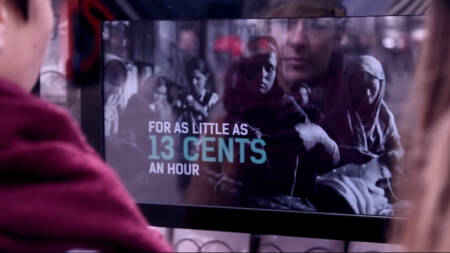 Mas, ao colocar o dinheiro na máquina, a camiseta não era entregue. Ao invés disso, a vending machine começava a passar um vídeo mostrando imagens de confecções reais com pessoas trabalhando em situação de escravidão, ganhando 13 centavos por hora em jornadas de 16 horas por dia.