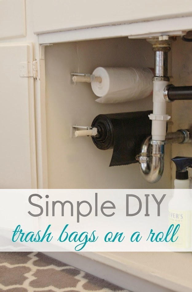9. Para um acesso fácil, crie um suporte de sacolas de lixo embaixo da pia