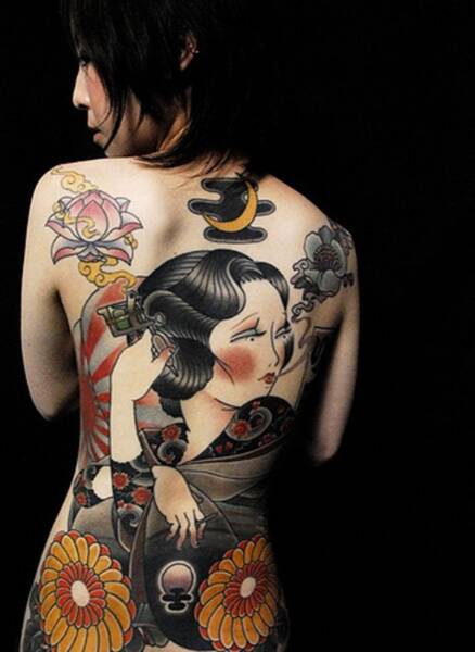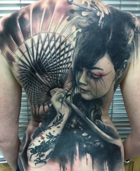 Tatuagens de Gueixa são amadas pelas pessoas que amam a cultura japonesa. Muitas vezes são caracterizadas por uma menina vestida de gueixa com um quimono tradicional colorido.