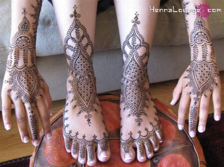 Abaixo estão apresentados alguns exemplos de Designer Mehndi, Mehndi nupcial, Mendi árabe, aplicados na palma da mão e no pé.